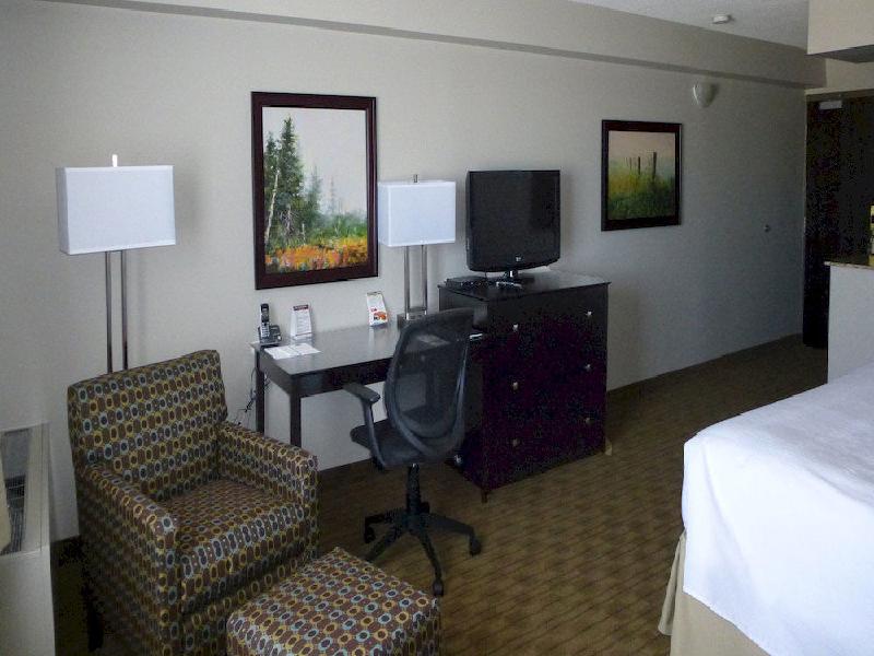 Our room was nice with a very modern bathroom. We arrived on a snowy day so it was nice not to have to leave the hotel to go out again for supper. The next morning we had breakfast in the same restaurant but had to wait a fair amount of time as there was only one person cooking and there were quite a few people in the dining room. The breakfast was excellent but it delayed our departure. Having the gas stations right across the street was also handy.