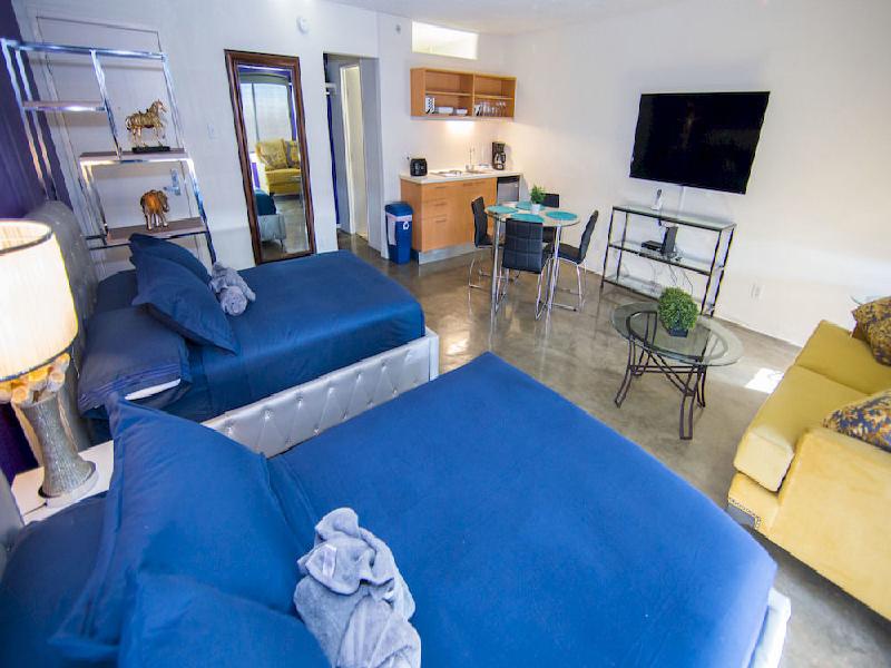 Overall the room was average - offering a mini-fridge, microwave, and coffee-maker. A small bag of plastic eating utensils, napkins, and paper plates was provided in the cabinets for use. My king sized 2-room suite had the main room with a king sized bed, which was comfortable, the mini-fridge, TV, desk, sitting chair, closet with a safe, and a dresser. The second room was simply a couch, dresser with TV, table with 2 chairs, cabinets with a microwave and a sink. No windows in the second room. Rooms are minimally decorated, so it's not a place for you to feel "at home" in - just more of a place to just come back from business or sightseeing to go to sleep.