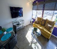 The location: keep in mind that you are in downtown LA. The neighborhood has a lot of homeless on the streets, the park is questionable however we went for a walk there, didn't get robbed. Every morning there are little "booths" set up on the streets with locals selling all sorts of things. Felt like Tijuana. However, you turn the corner towards the hotel and go in and it's clean, modern and quite safe. You can get anywhere in about 30 minutes it seemed. Uber found us with no problem. Uber Eats was great, lots to choose from in the area.