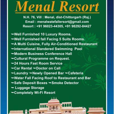 Menal Resort is located at MENAL (Chittorgarh, Rajasthan) & on the bank of Rajathan's one and only natural waterfall and natural beauty. The resort offers rooms mainly in four categories to its visitors such as Executive Air Cooled rooms, Deluxe rooms, Super Deluxe rooms and Suite rooms. The resort is around 170 kms away from Dabok airport, 16 kms away from Mandalgarh railway station, 170 kms away from Udaipur, 90 km. from chittorgarh, 85 kms from Kota . The resort provides various facilities to its customers as 24 hours power backup, they provide safe at reception/room, 24 hours front desk available for the help of the tourist, hot and cold running water available 24 hours in the washrooms attached to each and every room, lobby in the guest house and mechanism for controlling the pests for the care of the health of its customers. Check-in and check-out time being the same as 12:00 hours.