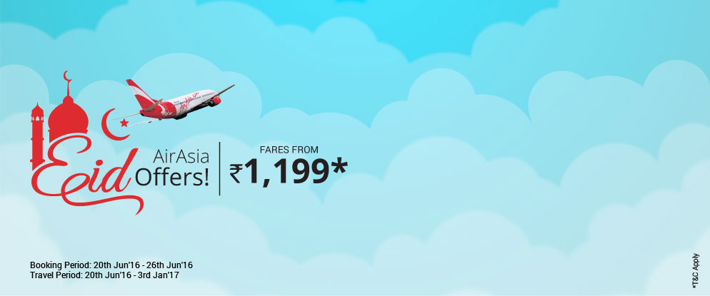 AirAsia Offers Eid Special Offers on Domestic Flights. Now celebrate Eid at your home with airasia lowest airfares starting from Rs. 1199! Limited Period Offer on Via.com. Hurry!