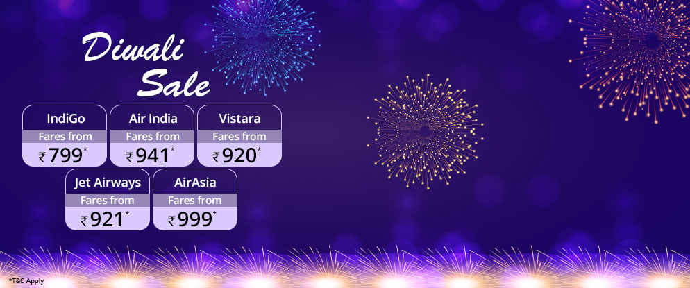 Indigo, AirAsia, Air India, Jet Airways & Vistara Announces diwali sale on domestic flights. Plan your holidays in advance with lowest airfares starting from Rs. 799*. Limited Period Offer. Hurry!
