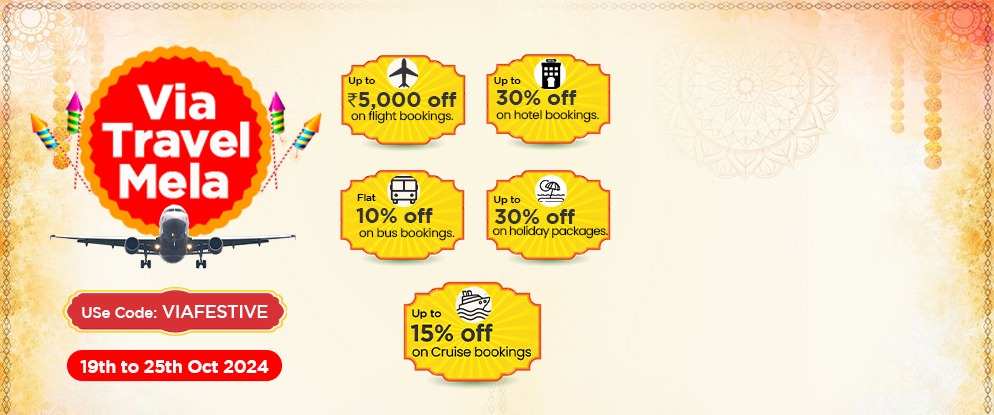 Book Cheap Flights, Hotels, Holiday Packages, Bus Tickets, and Cruises with Via.com! Enjoy up to ₹5,000 off on domestic flights, up to 30% off on holiday packages (up to ₹30,000), flat 10% off on bus bookings (up to ₹500), 30% off on hotels (up to ₹10,000), and up to 15% off on cruise bookings. Take advantage of these incredible travel offers and plan your next trip today!